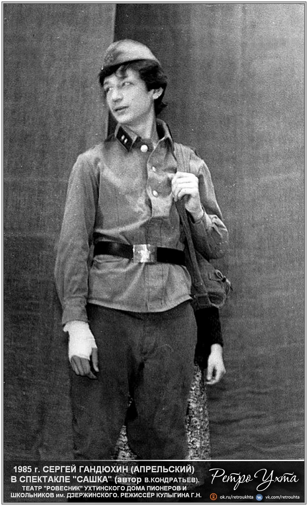 Еще была одна интересная история: в 8 классе я подошел к преподавателю по основам государства и права, не помню уж ее фамилию, это в сентябре было. Я спросил, - Что нужно сделать, чтобы сниматься в кино? Она сказала, - Нужно пойти в юношеский театр “Ровесник”, позаниматься там и тебе дадут направление - справку. И с этой справочкой ты без экзамена сможешь поступить в любой театральный ВУЗ страны. И вот на эту чепуху я купился. Но я ничуть не жалею об этом. Я сразу влюбился в это новое дело, влюбился в девчонок, влюбился в сцену. Играли спектакли “Сашка” по Кондратьеву, я играл там лейтенанта Володьку и получил диплом за лучшую мужскую роль. Наш театр “Ровесник” всегда занимал по республике 1-ые места на конкурсах и фестивалях. Была еще постановка “Барак”, и мы снова первое место заняли по республике.