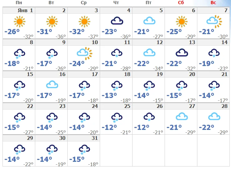 В последующие две-три декады января погода будет формироваться под влиянием чередующихся северо-западных циклонов и арктического антициклона, которые будут распространяться за ними. Циклоны приведут к снегопадам и потеплению, а после их отхода на восток вернется сухая морозная погода. При потеплении температура поднимется до -2...-7°C. Однако, с возвращением холода, который наиболее вероятно ожидается в середине января, ожидается, что температура повсеместно опустится до -18...-25°C, а при прояснениях даже до -30...-35°C. На севере и востоке республики могут быть достигнуты значения до -44°C.
