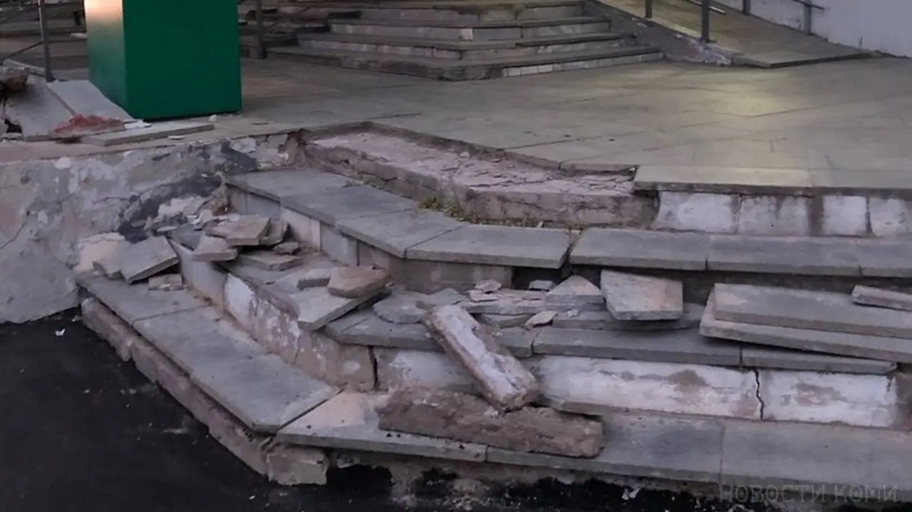 Тротуар у здания Госаптек на улице Ленина в Сыктывкаре отремонтировали еще в прошлом году. Однако крыльцо главной аптеки Коми никто так и не отремонтировал