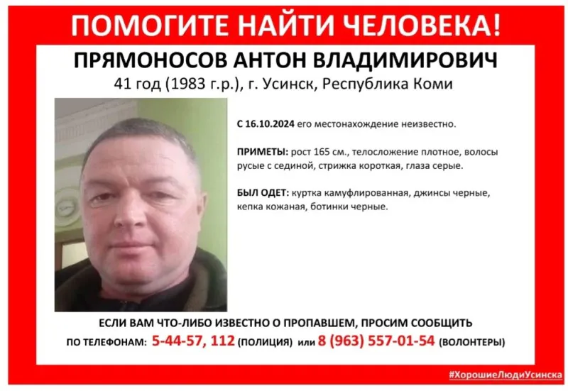 В Усинске разыскивают пропавшего 41-летнего Антона Прямоносова, информация о котором активно распространяется волонтерами группы "Хорошие люди Усинска". Мужчина исчез 16 октября 2024 года, с тех пор его местонахождение остается неизвестным. Близкие и друзья Антона выражают тревогу, так как он ранее не пропадал без предупреждения, и столь долгий период без связи вызывает серьезные опасения.
