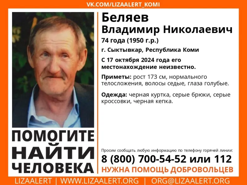 В Сыктывкаре объявили о поисках пенсионера Владимира Беляева, который пропал без вести 17 октября 2024 года. Об этом сообщает поисковый отряд "Лиза Алерт", активно занимающийся розыском пропавших людей.