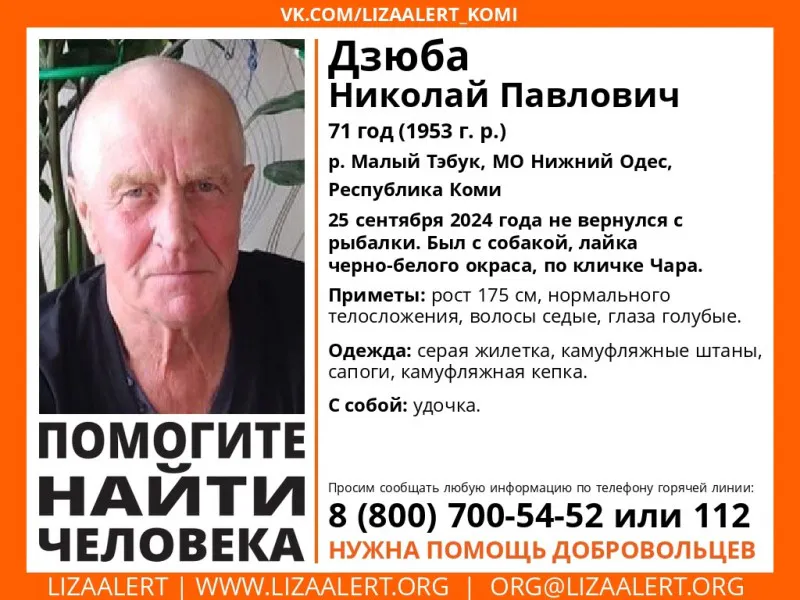 В поселке Нижний Одес, расположенном в Сосногорском районе Республики Коми, развернуты активные поиски 71-летнего мужчины, Николая Дзюбы, который пропал 25 сентября. Пенсионер отправился на рыбалку на реку Малый Тэбук и с тех пор не возвращался домой. По информации поискового отряда "Лиза Алерт", местонахождение мужчины остается неизвестным, что вызывает беспокойство как у его близких, так и у всех участников поисковой операции.