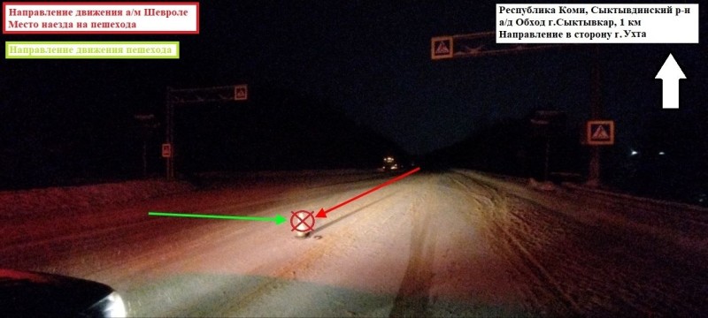 По предварительным данным, водитель Chevrolet Cruze, мужчина 1989 года рождения, двигался со стороны Ухты в направлении Кирова. На расстоянии 1 км от места происшествия он совершил наезд на пешехода, который переходил дорогу вне пешеходного перехода, справа налево, по ходу движения автомобиля.