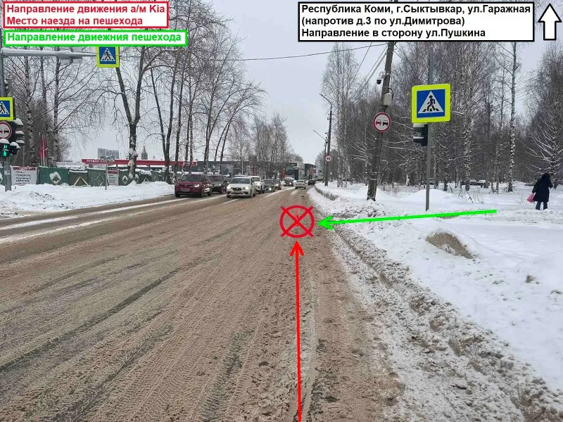 Одно из происшествий случилось в 8:55 утра. Женщина, родившаяся в 1980 году, управляла автомобилем Kia Rio и двигалась по улице Гаражной в направлении улицы Пушкина со стороны улицы Димитрова. Напротив дома № 3 по улице Димитрова она сбила пешехода, который переходил проезжую часть по регулируемому пешеходному переходу на зеленый сигнал светофора справа налево, по направлению движения автомобиля. В результате аварии пострадала пешеход — женщина, родившаяся в 1971 году. У нее диагностированы черепно-мозговая травма, сотрясение головного мозга, перелом копчика, а также ушибы лица и плеча. Пострадавшую госпитализировали. Водитель имеет стаж с 2008 года.