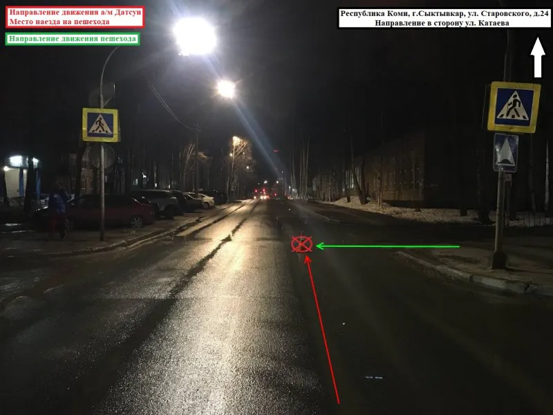Вчера вечером в Сыктывкаре случилось ДТП, в котором пострадал пешеход. Водитель "Датсуна" наехал на даму, пересекавшую проезжую часть по нерегулируемому пешеходному переходу. Инцидент произошел на улице Старовского, вблизи дома номер двадцать четыре.