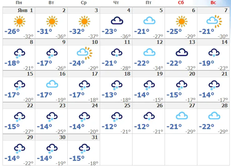 Таким образом, в январе Коми республика будет подвержена аномально холодной погоде, с нижними температурами и возможными снегопадами. Жители региона должны быть готовы к сильным морозам и принимать соответствующие меры для обеспечения своей безопасности и комфорта. Полностью отойти морозы могут только к концу января.