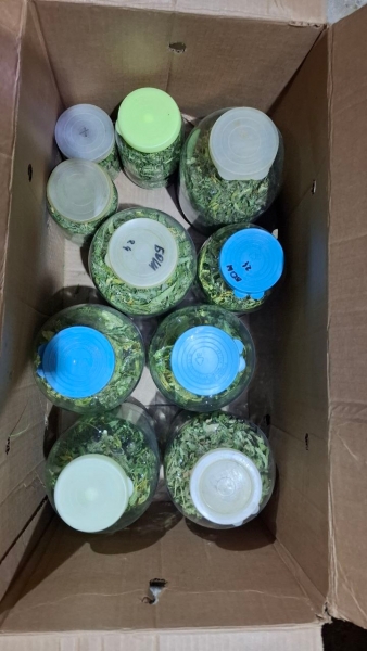 Основанием для подозрений стали данные о возможном хранении запрещенных веществ. Полицейские провели осмотр гаражного помещения, принадлежащего гражданину. В результате обыска там были найдены и изъяты вещественные доказательства: двадцать стеклянных банок, содержащих высушенные листья и части соцветий, а также четыре коробки из картона, наполненные стеблями растительного происхождения.
