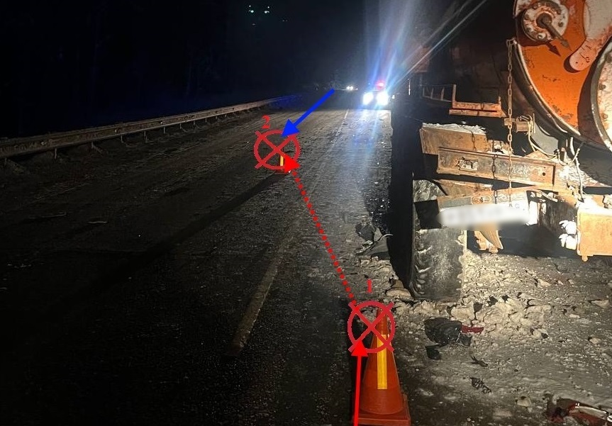 Водитель иномарки предпринял резкий объездной маневр, в результате чего его машина оказалась на стороне, предназначенной для противоположного потока, но это не спасло от первого столкновения — с тем самым грузовым автомобилем, которого он пытался избежать. После этого Chery не успела вернуться на свою полосу и врезалась во встречный тягач марки Volvo Trucks с прицепом.