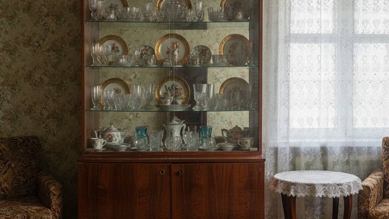 В эпоху, когда вещи не покупали, а «доставали», каждый предмет имел сверхценность. Постельное белье, отрезы ткани, сервизы — всё это копилось десятилетиями. Стенка с её бесконечными антресолями была единственным способом спрятать этот «золотой запас» от пыли и посторонних глаз, сохранив порядок в тесной хрущевке.
